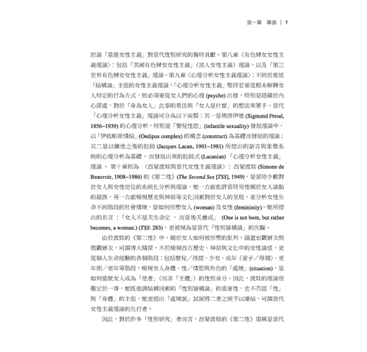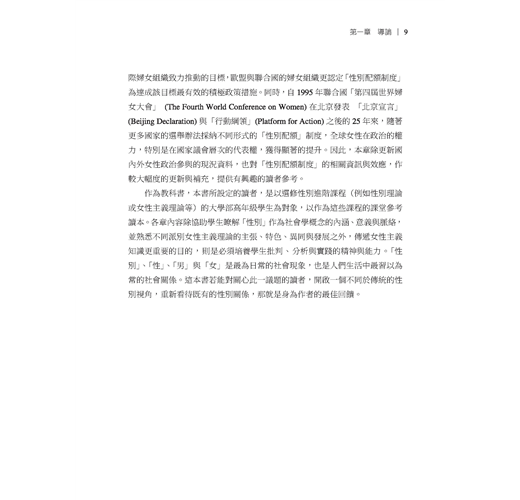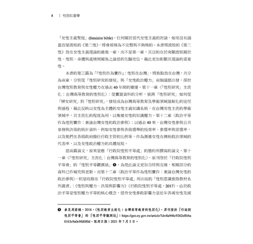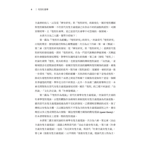 「性別社會學:性別作為範疇、理論與實作」立基於女性主義知識立場論,探究當代以「性別」作為社會分析的範疇而發展的思潮、建構的理論與實踐的場域;以跨領域的觀點,系統性地盤點女性主義者對當代性別社會關係的重要觀點、主要理論、及受到的批評。全書分為三部份:第一篇,導論:探究「性別研究」領域及「性別」作為社會建構概念的萌生,解惑傳統「性別」論述的迷思,解構「性/性別」的疑惑。第二篇,「當代社會學女性主義理論」:涵蓋當代主要的女性主義社會分析理論的內涵、彰顯各論說的特色、指出理論脈絡的關連與個別理論所受到的批評;最後以討論西蒙玻娃的「第二性」總結。第三篇,「性別實作:性別在台灣」:秉持「知識」必也「實作」的觀點,以「性別研究」在學院的建制與「女性參政」作為示範「性別實作」的場域,顯現台灣性別圖像的多元樣貌。本書除希望增進讀者對「性別」概念的內涵、意義與脈絡的瞭解,熟悉不同派別女性主義理論的主張、特色與批評,更重要的目的,則是培養學生批判、分析與實踐的精神與能力。