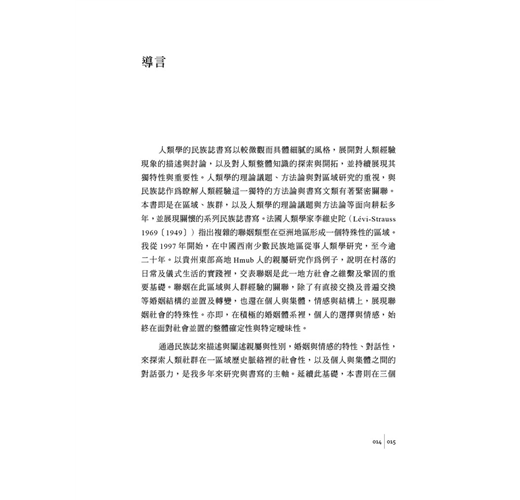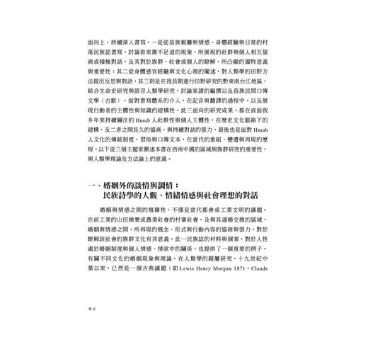 人類學的民族誌書寫以較微觀而具體細膩的風格,展開對人類經驗現象的描述與討論,以及對人類整體知識的探索與開拓,並持續展現其獨特性與重要性。人類學的理論議題、方法論與對區域研究的重視,與民族誌作為瞭解人類經驗這一獨特的方法論與書寫文類有著緊密關聯。本書即是在區域、族群,以及人類學的理論議題與方法論等面向耕耘多年,並展現關懷的系列民族誌書寫。法國人類學家李維史陀(Lévi-Strauss 1969〔1949〕)指出複雜的聯姻類型在亞洲地區形成一個特殊性的區域。我從1997年開始,在中國西南少數民族地區從事人類學研究,至今逾二十年。以貴州東部高地Hmub人的親屬研究作為例子,說明在村落的日常及儀式生活的實踐裡,交表聯姻是此一地方社會之維繫及鞏固的重要基礎。聯姻在此區域與人群經驗的關聯,除了有直接交換及普遍交換等婚姻結構的並置及轉變,也還在個人與集體,情感與結構上,展現聯姻社會的特殊性。亦即,在積極的婚姻體系裡,個人的選擇與情感,始終在面對社會並置的整體確定性與特定曖昧性。