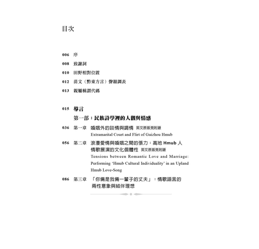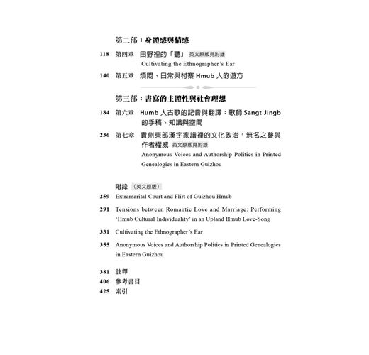 貴州東部Hmub人的情歌內容,不僅細微一致地唱和著交表聯姻為底層的社群理想,而且語言符號的演述活動本身,讓個人價值在期待聯姻結群的優勢氛圍裡,低調卻穩定地現身。本章指出三種語言符號活動所演述的Hmub人性別意象:一、男女歌者有序的輪唱,突出兩性對唱與性別對等意象的象似(iconic)關係;二、親屬稱謂等人稱語彙的組合、解組、替換,標示著歌者在性別認同的主體性與流動性(兩性合一與兩性分立),突顯語言符號與性別意象的指示(indexical)關係;三、通過人稱語彙同義詞的大量群聚與重復,以圖形的象似性,展現Hmub人情歌語彙,以語意之外的符號活動,創造出涵蘊Hmub人觀的性別意象。換言之,Hmub人情歌語言符號行動在同一場域演述著性別差異的創造與模糊。差異,不必然是相互排除的對立,也可以在建構兩性有所區辨(分立)的對照中,並存著彼此支援(結伴)的正向力量。