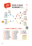 ◆ 用跟讀的方式真正培養「看到單字就會唸」、「聽到單字就會拼」的直覺反應能力緊接著拿起手機掃描QR碼,或者可以先將全書音檔下載在手機中或是電腦硬碟中,用播放程式撥放。然後跟讀專業母語人士的發音,模仿準確道地的發音。本書精選1200個中學以前必學的基礎單字,並以「音形相近」為編排原則,將相同字母組合及相近發音的單字串聯在一起,在看過一張全彩的導圖並將這個字母組有關的字彙囊括在一起之後,接下來的設計是以相同字母組合的排列跟讀,輕鬆更不容易忘記。比如從字母c開始的 can、cancel、candy、candle,體會 can 的發音,然後接 car、carpet、cartoon、carve,體會 car 的發音,然後是 cow 的音,跟讀 cowboy、cowbell、coward,然後自己發揮聯想力,想著「牛仔像個懦夫牽著牛走著,而牛鈴響著響著」的情節。下次再看到 cow 這個字時,就會自然想到其他從 cow 延伸出去的單字。接著要真正深入掌握字母組合適用的自然發音規則。例如「子音字母 + a + 子音字母」的組合,從剛剛學到的 can 再延伸到 cap、cat、cash... 幾個你早就熟悉的單字。