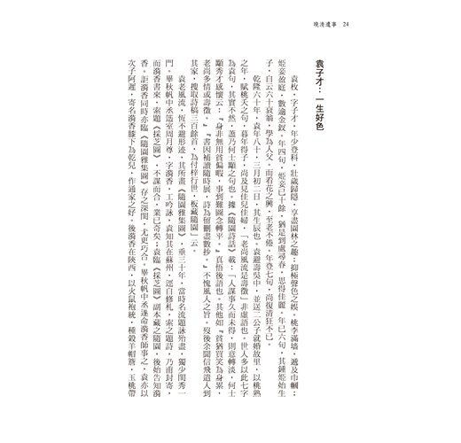 袁枚,字子才,年少登科,壯歲歸隱,享盡園林之趣:抑極聲色之娛。桃李滿墻,遞及巾幗;姫妾盈庭,數逾金釵。年四旬,姫妾已十餘,猶是到處尋春,思得佳麗。年已六旬,其鍾姫始生子,自云六十衰翁,學為人父。而看花之興,至老不倦。年登七旬,尙復清狂不已。