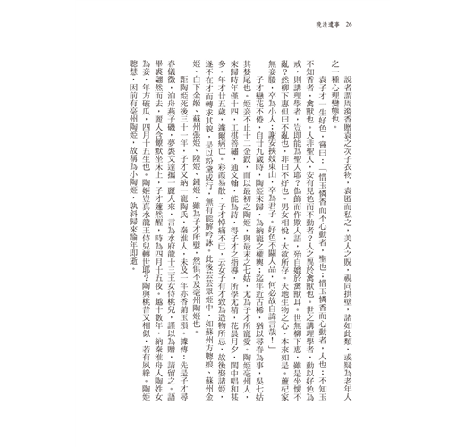 子才戀花不倦,自廿九歲時,陶姫來歸,為納寵之權輿;迄年近古稀,猶以尋春為事,吳七姑其婪尾也。姫妾不止十二金釵,而以最初之陶姫,與最末之七姑,尤為子才所寵愛。陶姫亳州人,來歸時年僅十四,工棋善繡,通文翰,能為詩,得子才之指導,所學尤精,花晨月夕,閨中唱和甚多,年才廿五歲,遽爾病亡。彩霞易散,子才悼痛不已,云女子有才致為造物所忌,故後娶諸姫,遂不在才而轉求其貌,是以粉黛成行,無有能解吟詠。此後芸芸眾姫中,如蘇州方聰娘、蘇州金姫、白下金姬、蘇州張姫、陸姫、鍾姫,雖為子才所嬖,然俱不及亳州陶姫也。