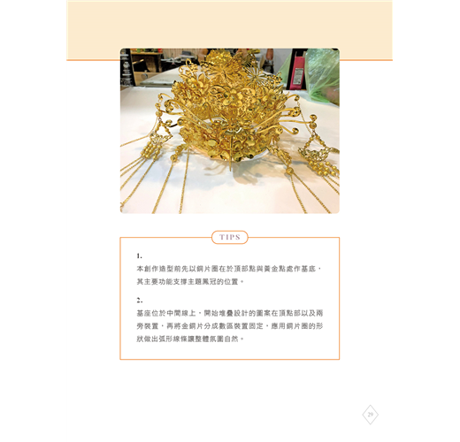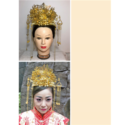 以文化創意,發揮複合媒材創作,轉換為現代新娘的鳳冠,將傳統工藝運用在新娘造型。