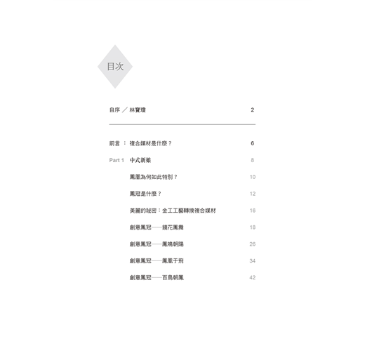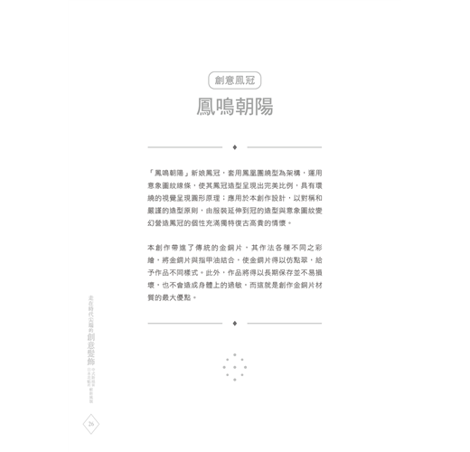 綜觀古今,以中國鳳冠及日本花魁為創作主題的書,少之又少。今與好友玠瑜共同創作編撰,集結我們的創作思維編撰成書,期待此書對生活美學有顯著的幫助與貢獻,更期待提供未來更多的創作者做為參考,而校園裡的莘莘學子,更能將此書奉為瑰寶,得到更多創作靈感。掛一漏萬實所難免,祈願先進不吝指教。