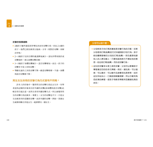 在呈現方式上,首先描述孩子的行為(如玩躲貓貓),再從幼兒發展的角度,解釋行為的學理(如嬰兒的認知)、以及隨年齡增長,孩子行為的變化與學理(如從躲貓貓發展到捉迷藏遊戲)。