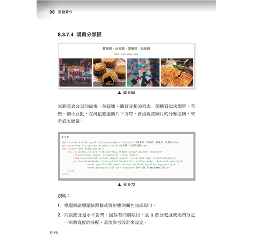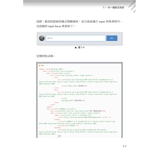 作者著重在實際開發時的心得與情境,帶您從零開始,入門核心觀念、實作小功能介面,到呈現一個基本頁面的響應式網頁,後續也使用 jQuery 與 Vue.JS 為範例作為框架引入 Tailwind CSS 實際開發案例,完成一個靜態網頁。
