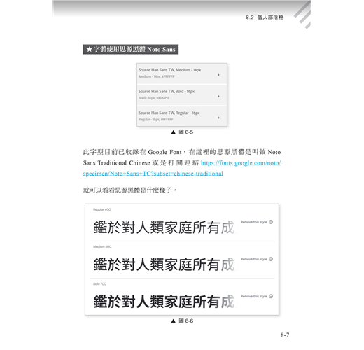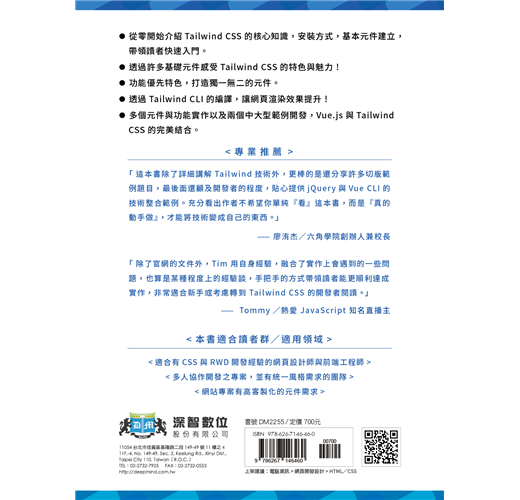 「這本書除了詳細講解 Tailwind 技術外,更棒的是還分享許多切版範例題目,最後面還顧及開發者的程度,貼心提供 jQuery 與 Vue CLI 的技術整合範例。充分看出作者不希望你單純『看』這本書,而是『真的動手做』,才能將技術變成自己的東西。」—— 廖洧杰/六角學院創辦人兼校長