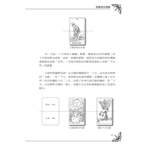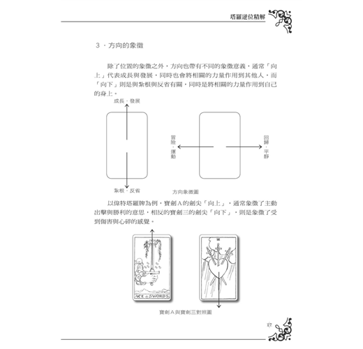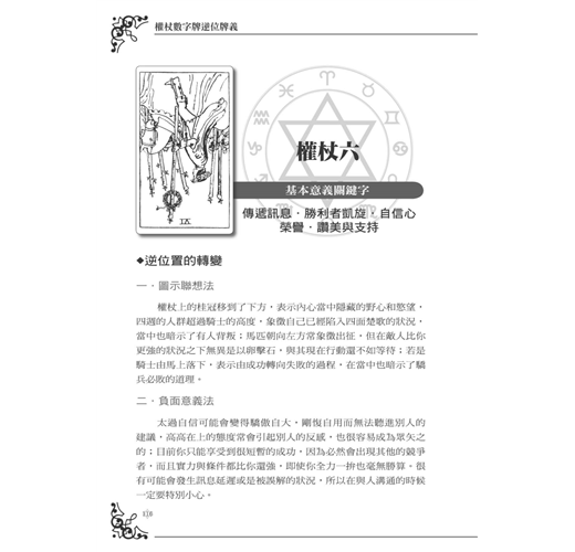 ▹本書針對牌義的說明,著重在基本意義的介紹,這是比較完整的呈現,對於進階者來說,這樣的說法較為清晰明瞭,並能熟練到可以區別正逆位的不同。