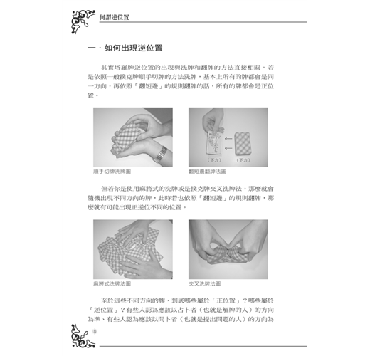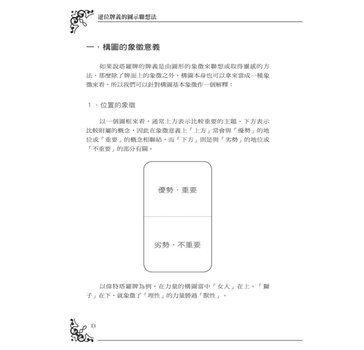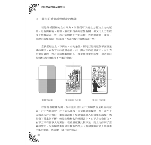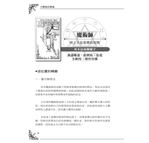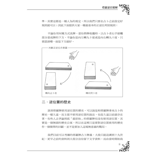 基本上在塔羅占卜當中,逆位置的運用可以分成兩大部分,一部分為「逆位置的牌義」運用,另一部分則為「逆位置的解牌技巧」,因此本書在敘述上也應用這樣的區分。