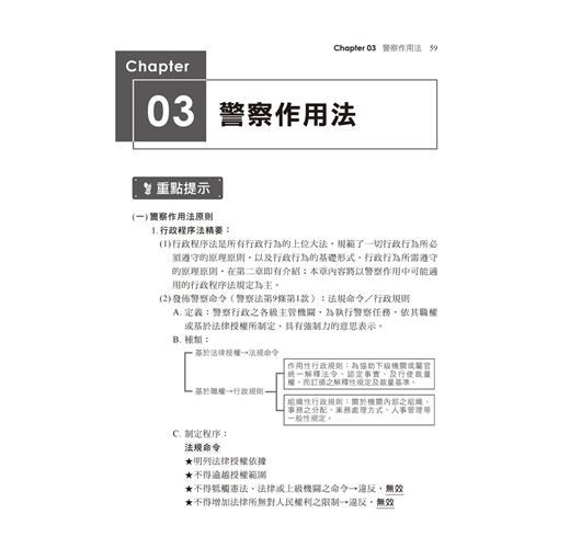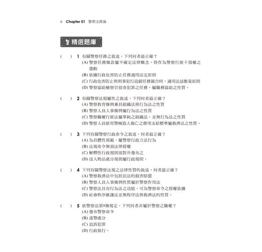 許多人面對法條,常有感到不知從何讀起的無助感,花了很多時間背誦記憶,但實際看到題目時,卻又不知如何運用或者是容易忘記,因此得出法規很難記憶的結論。本書編寫有鑑於這些困難點,將所以的警察法規,以精要的內容重點整理,搭配圖表的傳達方式讓你快速掌握重點!另外,章後還有相關的精選題庫,可以讓你隨時檢視學習成果。