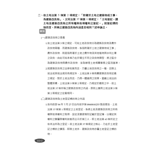 【土地登記實務】這科最大的痛處是概念非常模糊抽象,起初打算硬背土地登記規則的每一條文。開始動筆做題目後慢慢能歸納重點,這一科反倒是直接從寫題目,看擬答來整理筆記。做了近15年的考古題2遍,抓到作答訣竅「先解釋題目」,若要回答土地登記規則107條,先解釋分別共有,引用民法824-1條等,融合民法、土法相關法條小題大作,如此篇幅才夠多!因為這個科目考生們相對高分,能寫得越完整分數越好看,作答時亦需注意時間掌控。