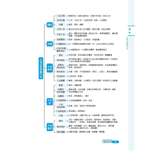 本書藉由歷年試題判斷常考重點,加以整理建立基本概念,易混淆的觀念使用表格做統整,透過互相對照,毫不費力就釐清概念。並將歷年試題穿插內文相對應位置,讓讀者掌握土地法規精要部分,一本在手,奧義盡取。更特別的是,本書於每章前都作有體系表,目的是要讓讀者能在閱讀內文前,先有體系概念,並在念完後,能回頭審視自己有無漏掉哪些重要觀念,使讀者不至於見樹不見林,擁有完整概念架構!