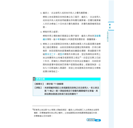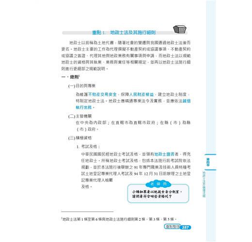 本書採雙色印刷,答題關鍵字以藍色標記,利用黑白藍三種色調,使用圖表整理繁雜內文,進行系統性學習。多一種顏色,多一道區隔,就是要使土地法規在讀者腦海中建構相關法規體系,更見清晰。