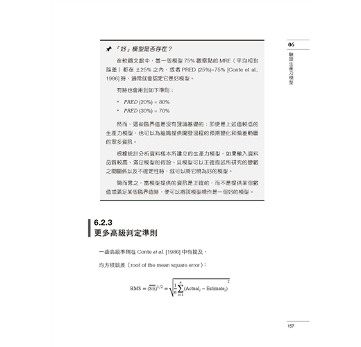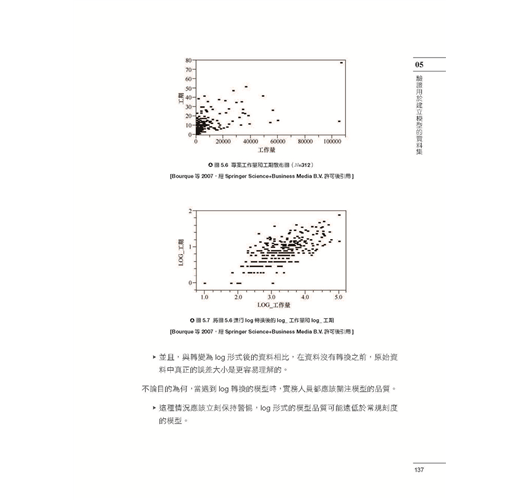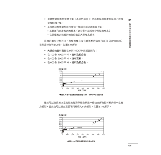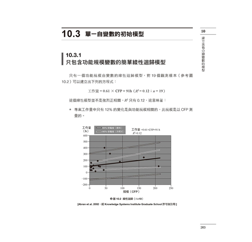 ► 第三部分探討建立估算模型過程中的相關問題,包括資料收集以及使用國際標準,以便在專案間、組織間、國家間橫向對比。除此,如何使用品質資料作為輸入並根據一系列經濟學概念來建立具有多個自變數的模型。