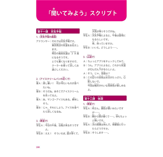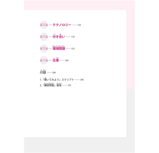 •「付録」:有「聞いてみよう」的文字化全文和「練習問題」的解答,提供學習時參考的依據。