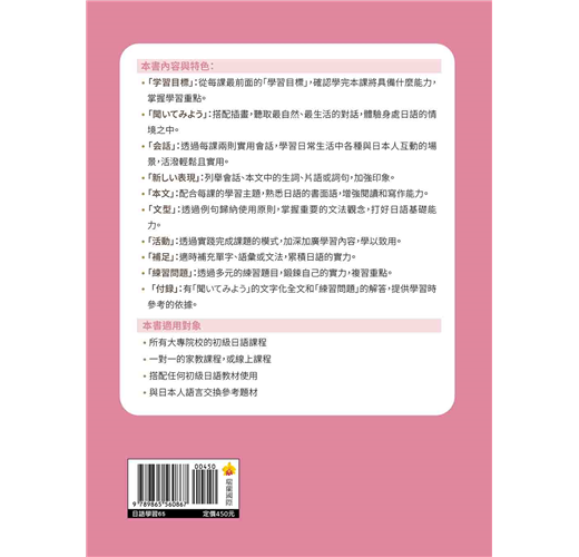 本教材重視培養聽、說、讀、寫、譯及綜合運用的日語能力,教師可以藉由每課頁首的「学習目標」、「聞いてみよう」引導學生進入該課的情境,「学習目標」揭示了該課的學習重點及將達成的能力目標;「聞いてみよう」呈現最生活化、最自然的日語對話,先讓同學們透過插畫場景,進入聽日語的世界,培養在情境中聽解日語的能力,同時引導熟悉語音,啟發學習日語的動機。「会話一」和「会話二」安排透過各種情境的對話,學習該課重點的新單字與句型表達,讓學生自然學會基本的日語表達方式;「本文」則藉由短文,培養閱讀能力、習得正確文法的基礎寫作技巧。「活動」是以完成課題的模式,在實作中讓同學透過互動、呈現學習成果。「文型」匯集了該課重點句型表達,從例句中同學可歸納出使用的原則,亦安排與該課相關基礎文法資訊,方便學習;「練習問題」提供多元的練習實踐題目,並附解答參考,學生透過課後作業練習,可立即複習該課的重點,並自我檢核吸收的程度。本教材安排在各主題下,嘗試納入多樣的引導學習項目,這絕對是一本能讓教師快速且輕鬆引導莘莘學子學會使用日語的好教材。