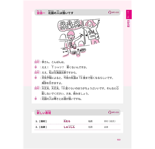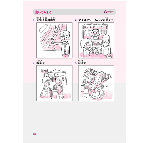 •「聞いてみよう」:搭配插畫,聽取最自然、最生活的對話,體驗身處日語的情境之中。