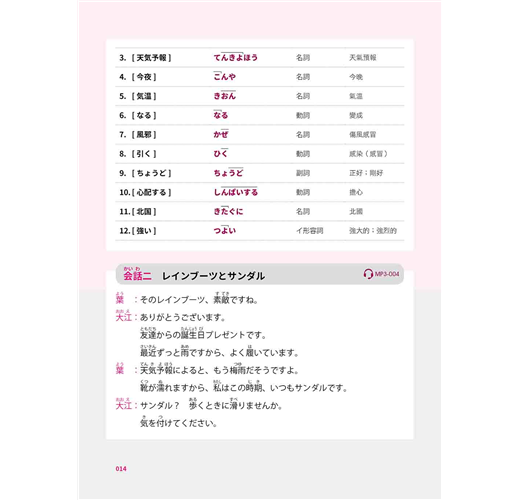 •「会話」:透過每課兩則實用會話,學習日常生活中各種與日本人互動的場景,活潑輕鬆且實用。