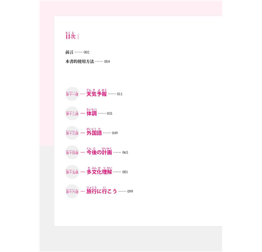 本書以現代大學生的生活為主軸,設計10個主題單元,包括日常生活中各種與日本人互動的接觸場景,活潑輕鬆且實用,從中可學會詞彙、句型的運用。除了培養基礎的聽、說、讀、寫、譯、綜合能力之外,也培養理解日本文化、社會,以及跨文化溝通技巧與實際運用之能力。