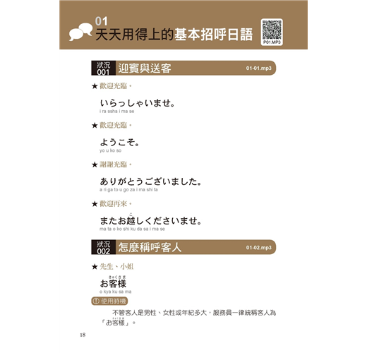 本書內介紹的所有服務業必備句型皆附有日籍人士錄音的發音示範,搭配中文翻譯對照,自然而然的幫您記住日文的意思,練聽力、練口說也更有感覺。音檔採QR碼掃描下載方式,不需要用到光碟機,只要用手機掃描即可馬上下載!也提供可將全書MP3一次完整下載的QR碼,不需註冊會員,或額外安裝自己不熟悉的播放APP才能聽,省去每次聽音檔都要掃描的麻煩。(註:打包下載檔案為ZIP壓縮檔,請先安裝解壓縮程式或APP再行下載,由於iOS系統對檔案下載的限制,iPhone用戶需升級至iOS 13以上,方可使用全書完整打包下載連結。)