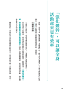 這些問題最重要的關鍵在於肩胛骨、脊椎與髖關節,作者特別針對這三個部位的活動度,設計了一套體操與軀幹肌肉訓練。能改善肩胛骨活動角度,扭轉脊椎與放鬆髖關節,對於肩膀、背部周圍的僵硬也有幫助,並增進全身的血液循環。主要從三方面著手: