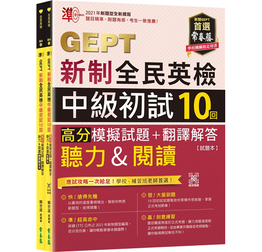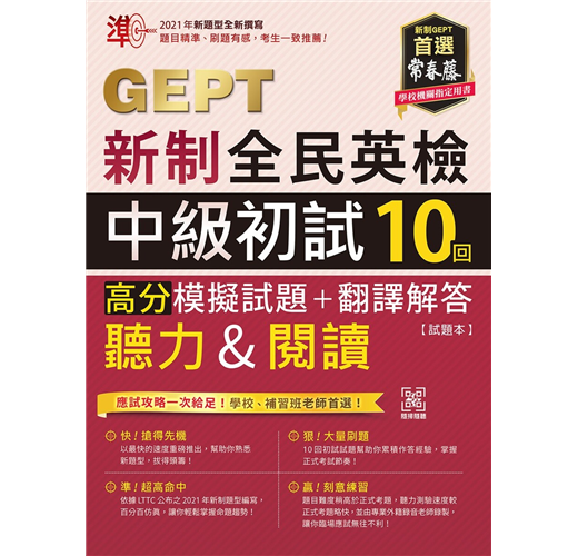 為因應此次改版,本公司亦在第一時間掌握由財團法人語言訓練測驗中心(LTTC)頒布的最新考題,經中外編輯多次研擬、網羅各種新鮮題材,最終完成這本完全仿真的《準!GEPT 新制全民英檢中級初試 10 回高分模擬試題 + 翻譯解答(聽力&閱讀)》。為讓讀者能快速熟悉新制全民英檢考試方向、增進應考實力,我們亦在試題本內提供「應試攻略」,為讀者深度剖析新制題型的出題脈絡並分享解題技巧,且此套書的難易度故意設定為比實際考試再難一點。同時,為了那些不方便使用光碟放音機的讀者,我們貼心地將音檔上傳雲端,只需掃描 QR Code 便能進行測驗。各位讀者若能善用此套書,相信必能全面「贏」戰新制考題,更能在中級測驗裡百發百「中」、勇奪高分!祝大家學習愉快!