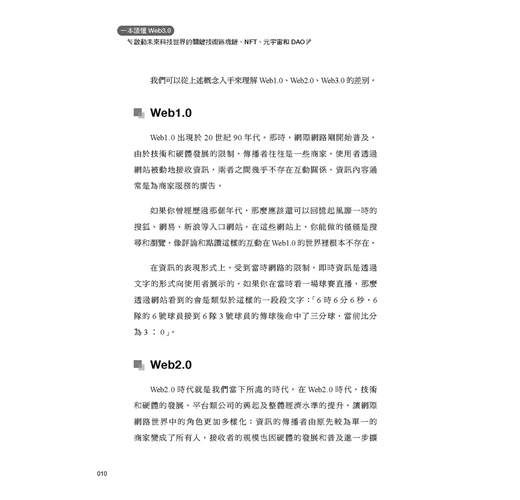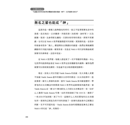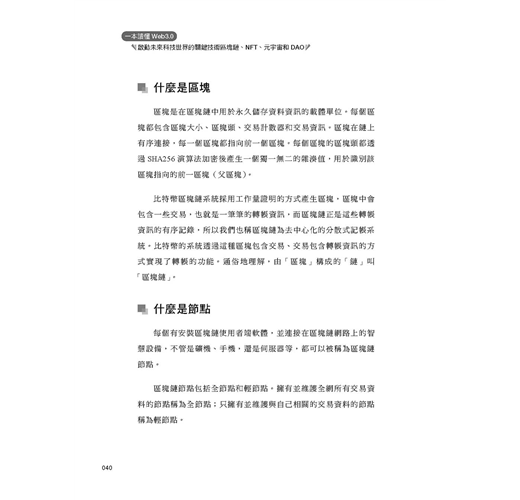本書帶你快速全面瞭解 Web3.0。希望可以淺顯地為各位讀者介紹 Web3.0。雖然區塊鏈、NFT、元宇宙、DAO 都是近兩年比較熱門的話題,但是鮮有資料將它們系統地串聯起來討論。