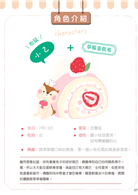 【松鼠小乙】雖然是隻松鼠,卻有著像兔子的球狀尾巴,總覺得和自己的同類長得不一樣,所以天天黏在蛋糕卷旁邊,偽裝自己有大尾巴,生性愛哭,但是哭完就會重新振作,偶爾和同伴聚會才會吃橡果,最愛軟嫩多汁的草莓,房間的擺飾都是草莓圖案。