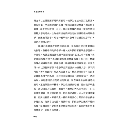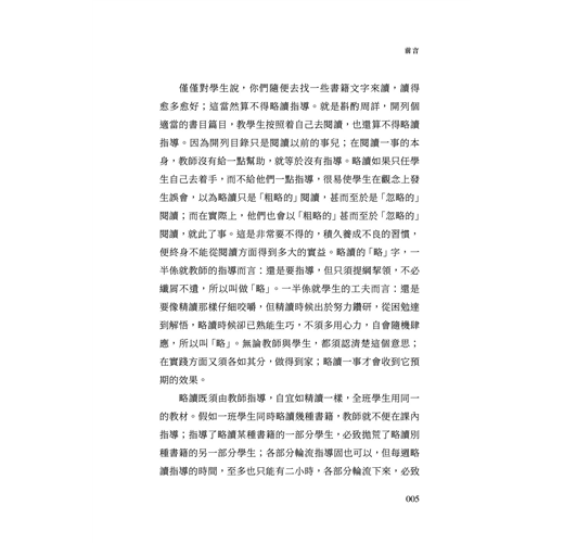 僅僅對學生說,你們隨便去找一些書籍文字來讀,讀得愈多愈好;這當然算不得略讀指導。就是斟酌周詳,開列個適當的書目篇目,教學生按照着自己去閱讀,也還算不得略讀指導。因為開列目錄只是閱讀以前的事兒;在閱讀一事的本身,教師沒有給一點幫助,就等於沒有指導。略讀如果只任學生自己去着手,而不給他們一點指導,很易使學生在觀念上發生誤會,以為略讀只是「粗略的」閱讀,甚而至於是「忽略的」閱讀;而在實際上,他們也會以「粗略的」甚而至於「忽略的」閱讀,就此了事。這是非常要不得的,積久養成不良的習慣,便終身不能從閱讀方面得到多大的實益。略讀的「略」字,一半係就教師的指導而言:還是要指導,但只須提綱挈領,不必纖屑不遺,所以叫做「略」。一半係就學生的工夫而言:還是要像精讀那樣仔細咬嚼,但精讀時候出於努力鑽研,從困勉達到解悟,略讀時候卻已熟能生巧,不須多用心力,自會隨機肆應,所以叫「略」。無論教師與學生,都須認清楚這個意思;在實踐方面又須各如其分,做得到家;略讀一事才會收到它預期的效果。