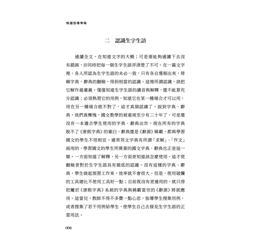 通讀全文,在知道文字的大概;可是要能夠通讀下去沒有錯誤,非同時把每一個生字生語弄清楚了不可。在一篇文字裡,各人所認為生字生語的未必一致,只有各自選剔出來,倚賴字典、辭典的翻檢,得到相當的認識。這裡所謂認識,該把它解作最廣義。僅僅知道生字生語的讀音與解釋,還不能算充分認識;必須熟習它的用例,知道它在某一種場合才可以用,用在另一種場合就不對了,這才真個認識了。說到字典、辭典,我們真慚愧,國文教學的被重視至少有二十年了,可是還沒有一本適合學生使用的字典、辭典出世。現在所有的字典脫不了《康熙字典》的窠臼,辭典還是《辭源》稱霸,都與學習國文的學生不很相宜。通常英文字典有所謂「求解」、「作文」兩用的,學習國文的學生所需要的國文字典、辭典也正是這一類。一方面知道了解釋,另一方面更知道該怎麼使用,這才使翻檢者對於生字生語具有徹底的認識。沒有這樣的字典、辭典,學生做起預習工作來,效率就不會很大。但是,使用破爛的工具總比不使用工具好一點;目前既沒有更適用的,就只得把屬於《康熙字典》系統的字典與稱霸當世的《辭源》將就應用。這當兒,教師不得不多費一點心思,指導學生搜集用例,或者搜集了若干用例給學生,使學生自己去發見生字生語的正當用法。