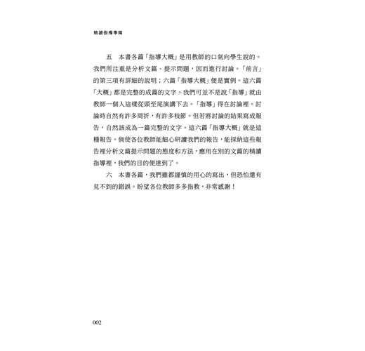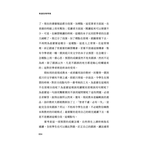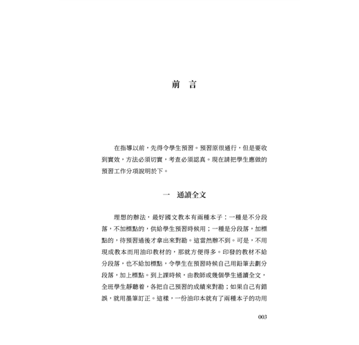 理想的辦法,最好國文教本有兩種本子:一種是不分段落,不加標點的,供給學生預習時候用;一種是分段落,加標點的,待預習過後才拿出來對勘。這當然辦不到。可是,不用現成教本而用油印教材的,那就方便得多。印發的教材不給分段落,也不給加標點,令學生在預習時候自己用鉛筆去劃分段落,加上標點。到上課時候,由教師或幾個學生通讀全文,全班學生靜聽着,各把自己預習的成績來對勘;如果自己有錯誤,就用墨筆訂正。這樣,一份油印本就有了兩種本子的功用了。現在的書籍報誌都分段落,加標點,這從著者方面說,在表達的明確上很有幫助;從讀者方面說,閱讀起來可以便捷不少。可是,在練習精讀的時候,這樣的本子反而把學者的注意力減輕了。既已分了段落,加了標點在那裡,就隨便看下去,不再問為甚麼要這樣分,這樣點,這是人之常情。在這常情裡,卻正錯過了很重要的練習機會。若要不放過這個機會,惟有令學者就一種一貫到底只有文字的本子去預習,在怎樣分、怎樣點上用一番心思。預習的成績當然不免有錯誤,然而不足為病。除了錯誤以外,凡是不錯誤的地方都是細心咬嚼過來的;這對於學者將是終身的受用。