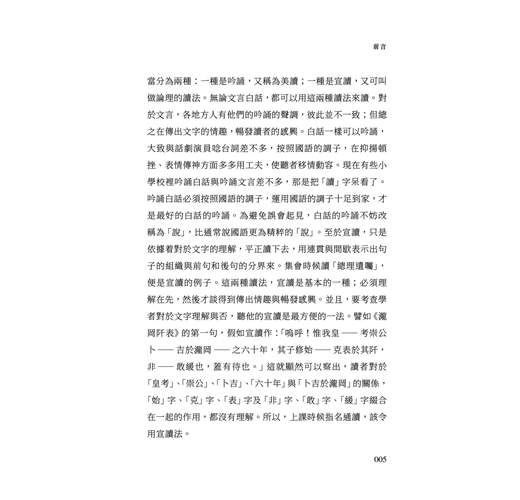 要考查這一項預習的成績怎樣,自然得在上課時候指名通讀。全班學生也可以藉此對勘,訂正自己的錯誤。讀法通常當分為兩種:一種是吟誦,又稱為美讀;一種是宣讀,又可叫做論理的讀法。無論文言白話,都可以用這兩種讀法來讀。對於文言,各地方人有他們的吟誦的聲調,彼此並不一致;但總之在傳出文字的情趣,暢發讀者的感興。白話一樣可以吟誦,大致與話劇演員唸台詞差不多,按照國語的調子,在抑揚頓挫、表情傳神方面多多用工夫,使聽者移情動容。現在有些小學校裡吟誦白話與吟誦文言差不多,那是把「讀」字呆看了。吟誦白話必須按照國語的調子,運用國語的調子十足到家,才是最好的白話的吟誦。為避免誤會起見,白話的吟誦不妨改稱為「說」,比通常說國語更為精粹的「說」。至於宣讀,只是依據着對於文字的理解,平正讀下去,用連貫與間歇表示出句子的組織與前句和後句的分界來。集會時候讀「總理遺囑」,便是宣讀的例子。這兩種讀法,宣讀是基本的一種;必須理解在先,然後才談得到傳出情趣與暢發感興。並且,要考查學者對於文字理解與否,聽他的宣讀是最方便的一法。譬如《瀧岡阡表》的第一句,假如宣讀作:「嗚呼!惟我皇—考崇公卜—吉於瀧岡—之六十年,其子修始—克表於其阡,非—敢緩也,蓋有待也。」這就顯然可以察出,讀者對於「皇考」、「崇公」、「卜吉」、「六十年」與「卜吉於瀧岡」的關係,「始」字、「克」字、「表」字及「非」字、「敢」字、「緩」字綴合在一起的作用,都沒有理解。所以,上課時候指名通讀,該令用宣讀法。