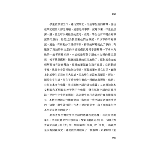 學生做預習工作,通行寫筆記,而生字生語的解釋,往往在筆記裡佔大部分篇幅。這原是好事情,記錄下來,印象自然深一層,並且可以備往後的查考。但是,學生也有不明白寫筆記的用意的;他們以為教師要他們交筆記,所以不得不寫筆記。於是,有胡亂抄了幾條字典、辭典的解釋就此了事的;有遺漏了真該特別注意的字語而僅就尋常字語解釋一下拿來充數的。前者胡亂抄錄,未必就是那個字語在本文裡的確切意義;後者隨意選剔,把應該注意的反而放過了;這對於全文的理解都沒有甚麼幫助。這樣的筆記實在沒有意思;交到教師手裡,教師辛辛苦苦地把它看過,更提起筆來替它訂正,實際上對於學生卻沒有多大益處,因為學生並沒有真預習。所以,關於生字生語,須在平時使學生養成一種觀念與習慣,就是:必須把本文作依據,尋求那個字語的確切意義;又必須把與本文相類和不相類的若干例子作依據,發見那個字語的正當用法。至於生字生語的選剔,為防學生自己去做或許會有遺漏起見,不妨由教師先行儘量提示,指明這一些字語是必須弄清楚的。這樣,學生做預習工作才不至於是徒勞,寫下來的筆記也不至於是循例的具文。