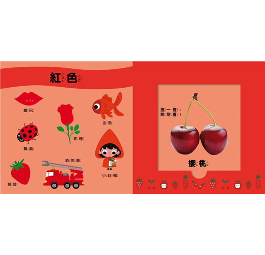 除了水果香味,在這本書中還能認識日常生活常見的顏色與物品,快來一起玩玩看吧!