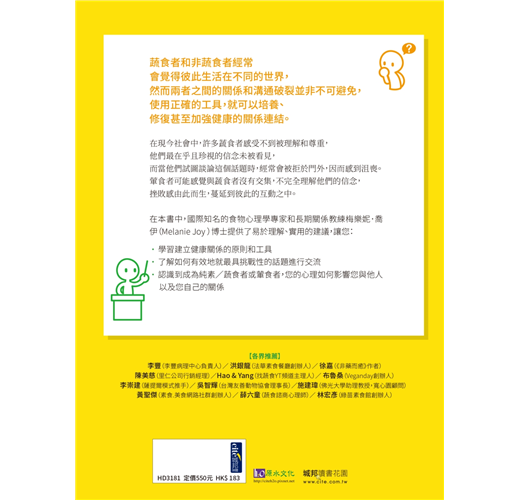 在本書中,國際知名的食物心理學專家和長期關係教練梅樂妮•喬伊(Melanie Joy)博士提供了易於理解、實用的建議,讓您能夠: