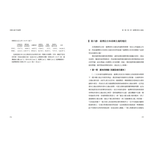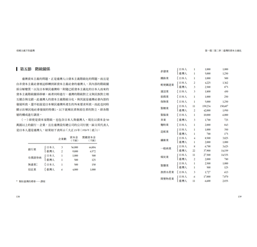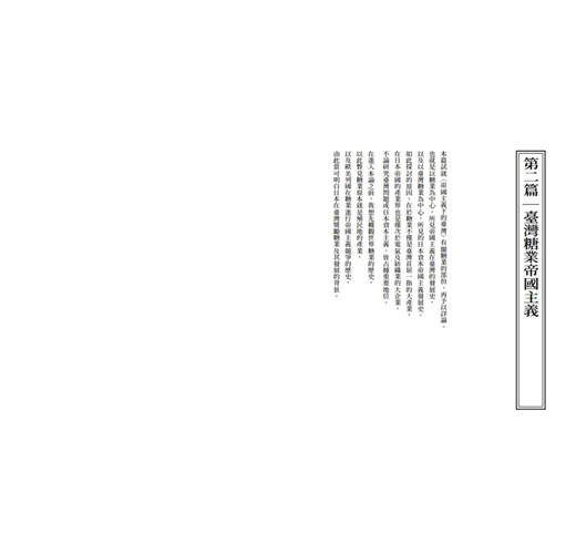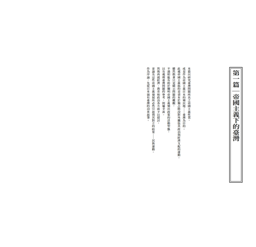 第二,本書雖然不是不作歷史性的敘述,不過我的主力灌注之處,在於說明事實所具之意義。就日本領有臺灣之後的情勢或其沿革、現狀,不乏臺灣總督府的出版物及其他著作,我希望能以這些官民出版物所提供的事實為材料,嘗試分析臺灣經濟、政治發展的事實關係、探究其社會意義,以說明日本統治臺灣的性質。而此意義及其性質,由於具備獨占資本主義階段的帝國主義特徵,因此本書以「帝國主義下的臺灣」為題。
