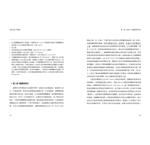 【註5】「根據糖業聯合會的調查,對中國的輸出於3年度〔即1928年──譯按〕(包含從臺灣的輸出)為340萬4,000擔,其價額3,301萬圓,佔日本輸出糖的九成左右。然而由於中國進口的砂糖達1,200萬擔,日本糖僅提供其中的3成,因此未來仍有逐漸向上發展的空間。不過反過來看,向來出口到中國的砂糖以香港糖及日本糖佔大多數,但是古巴糖最近因其砂糖增產對策,有向遠東地區傾銷之勢。爪哇糖也為了處理生產過剩的砂糖,努力對中國輸出,二者皆為日本精糖輸出的強敵。從價格、交易等各點來看,日本的輸出糖需要極大的努力」(《東京朝日新聞》昭和4年6月15日)。