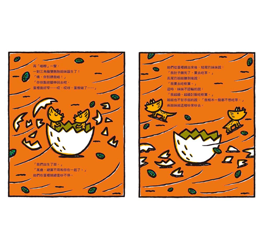 一對三角龍雙胞胎,長尾巴的是姐姐,短尾巴的是妹妹,明明是從同一顆蛋裡出生的,卻從蛋裡吵到蛋外,就算遇到虎視眈眈的霸王龍,也沒有停下爭吵。因為一句陰錯陽差的「嘿嘿嘿嘿嘿,看起來好好吃……」,霸王龍和三角龍姐妹將展開一段最感人肺腑的友誼……