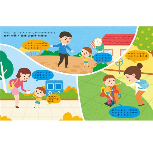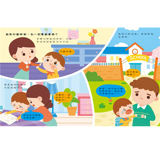 老師與爸爸媽媽用包容且正面的方式鼓勵浩浩坦承錯誤,更藉由情境假設,教導他學會有時候在誠實之前,要先懂得保護自己。