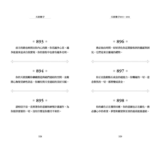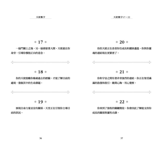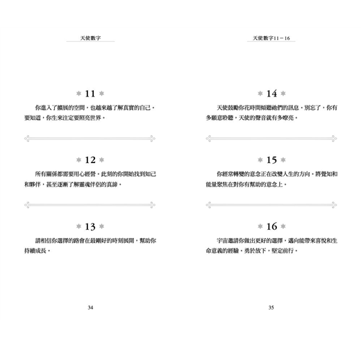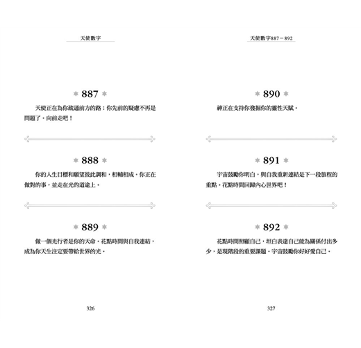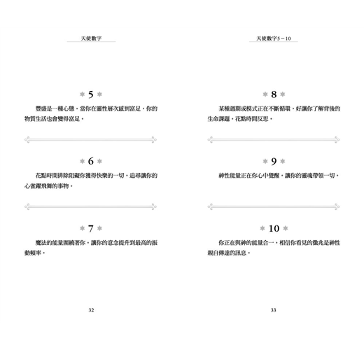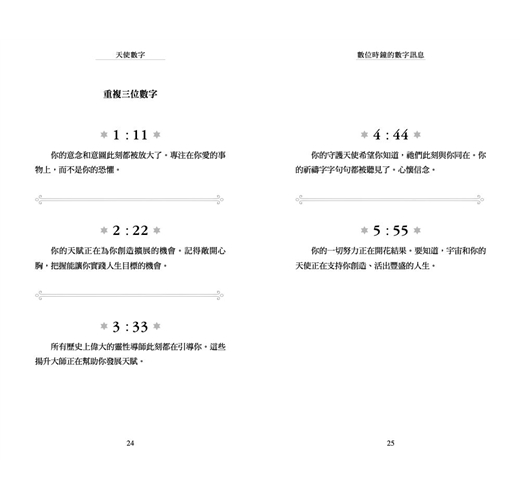 ◎當收到「天使數字」這主題的邀請時,我知道天使力量確實與我同在。我算是半麻瓜,雖不是靈媒,但我確實在翻譯《力量》時因提到留意「祕密象徵物」,開始把「連號數字」設定為其中一項,這段時間也很頻繁在路上看到連三、連四重複數字的車牌,那其實是我和宇宙溝通的通關密碼,甚至在社團也吸引了一些讀者和我一起記錄天使的足跡。