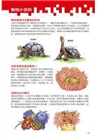 設有「動物小百科」單元,介紹擁有完美黃金比例的鸚鵡螺、喜歡晒日光浴的翻車魚、天生的偽裝高手竹節蟲等基本常識,以及其實不喜歡吃人的大白鯊、可以往後飛卻不會走路的蜂鳥、有尾巴且不是熊的無尾熊等超炫常識,讓小朋友有系統的學習。