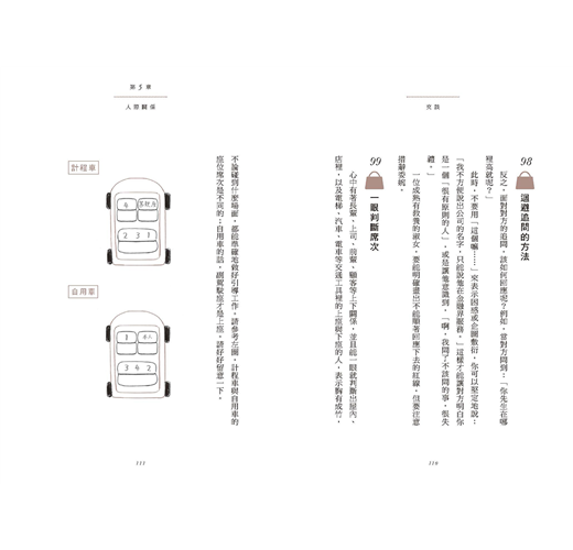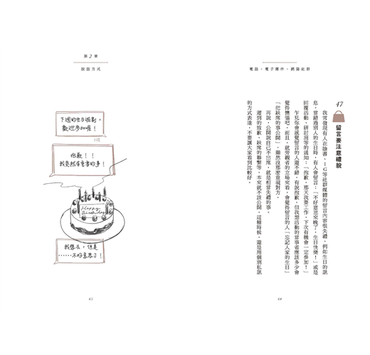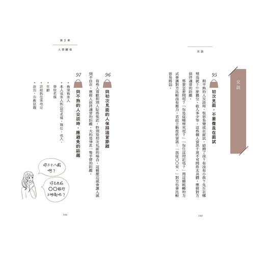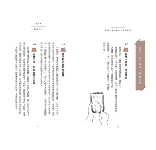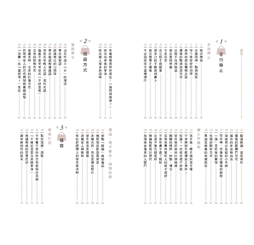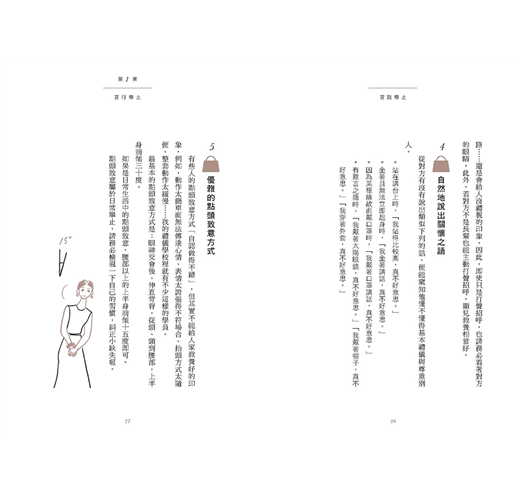 同時穿插「可以在捷運上化妝嗎?」「如何禮貌迴避同事間流傳的八卦?」「和主管一起搭車或吃飯的座次?」「吃西餐的正確順序」「去朋友家聚餐該準時抵達嗎?」等日常狀況,搭配風格清新的手繪插畫加以解說,一看就懂,隨翻即用。