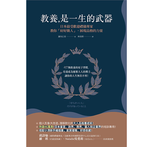 透過本書的說明,只要改變「教養」,人生將因此大不同。「優質的教養」是你一生的財產,只要擁有,便終生受用。我也認為「優質的教養」是每個人一生的武器,力量遠大於美貌。而且,任何人只要願意學習,從現在起就能獲得優質的教養。「教養」可以改變,也值得改變。改變教養的鎖鑰,就在你的手上。