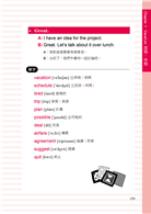 「情境對話」是生活中常會用到的談話內容;「句型解析」則讓讀者一次學到多種不同的說法;「單字片語」包括音標、單字的淵源及註解;「小錦囊」是作者搜集的一些生活小常識,供讀者參考;「課後小點心」有風俗民情及小故事,休息一下,再繼續衝刺,效果加倍!
