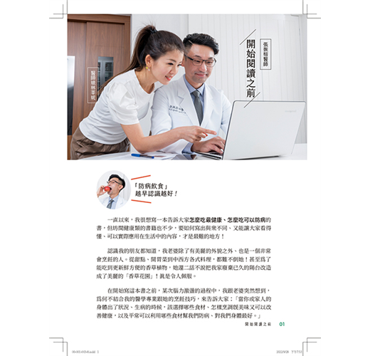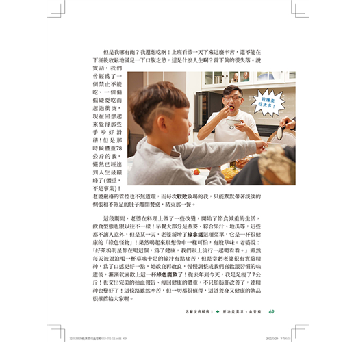 而醫師娘不但料理手藝有口皆碑,她為這本書設計食譜時更是融入醫學基礎,獨家精選62道防病料理、病後飲食,不是只有美味而已!她也擅長運用創意把健康卻不好吃的食材,以出人意表的方式搭配「新隊友」,上桌後變成連挑嘴的孩子都搶著吃的美食!也因此他們家的料理常被媒體採訪,不僅出菜迅速、變化多端、也兼顧營養滿點,完全實踐「三分治,七分養」(三分靠藥物治療,七分要靠自己養出強大的自癒力、把身體養健康)的防病之道!