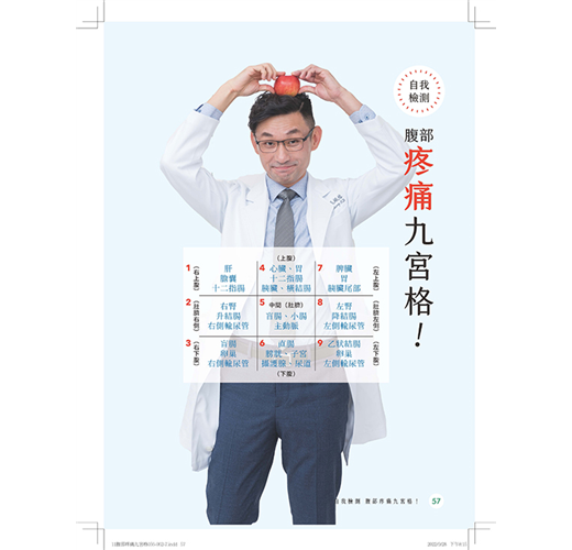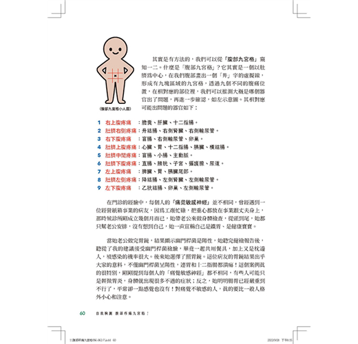 1.獨家首創「腹部疼痛九宮格」,並且解析對應各部位可能生的病:九宮格對應了五臟六腑的相應位置,簡單的分辨當我們肚子痛時,大概是哪裡出了問題?讓讀者在家裡肚子痛時也不必驚慌害怕,可以先搞懂大概的問題是什麼?