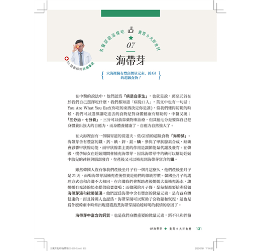 多年來他一直用醫學和科學方式,專注研究飲食、生活習慣對造成胃腸肝膽疾病的關聯性和傷害性,實證了一個人只要肯改變一些選擇、改變一些吃法、改變攝取營養的方式,就比別人更有機會遠離疾病、養出自癒力好底子!他所推薦的所有食材和吃法,不像有些專家只是參考網站或期刊而來,每一樣食物都跟他們一家或病友有很密切的、相關聯的故事或由來,也都是他們家餐桌上的日常選擇。