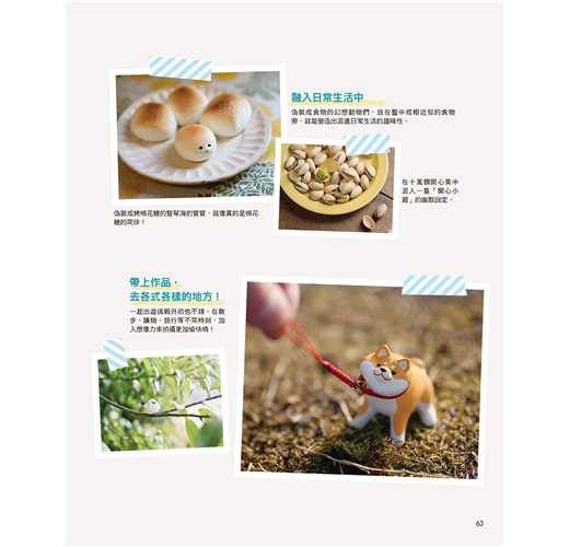 若能從繪製草圖時起,就已有鮮明的情境&動作表情,不僅能創作出生動傳神的作品,更方便延伸出除了簡單擺飾之外的玩賞性。書中收錄了一些作者的作品分享,如:運用保麗龍板、砂紙、吸管等簡易加工製作街道場景,在軟木塞玻璃瓶中配置小物件打造故事情景,以UV膠製作北極熊的冰原、小鴨的池塘。或將動物模型混入日常情境,如:相近大小與外形的食物中、自然陽光灑落的場景中,拍攝出有趣畫面感的好照片等。大家在完成作品後,不妨參考書中的分享,更進一步地自由發揮吧!