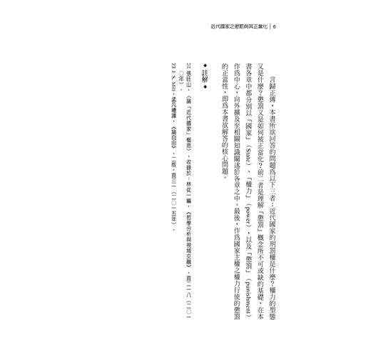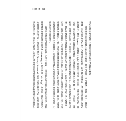 本書依次探討主權的權力本質、懲罰理論,進而歸納整理出本書欲回答的三點問題:近代國家的刑罰權是什麼?權力的型態又是什麼?懲罰又是如何被正當化?