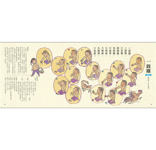 開心玩耍是孩子的天性,〈一放雞〉、〈一的炒米香〉、〈迺迺迺〉、〈唏咐挨〉、〈掩咯雞〉、〈點啊點茶鼓〉、〈枝仔冰〉、〈你欲食清〉這8首遊戲歌,有的可以一個人玩,有的是團體遊戲,配合歌曲邊玩邊唱,讓孩子在歡樂氣氛中感受道地台語的風采!